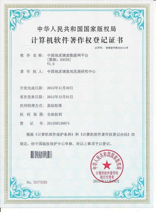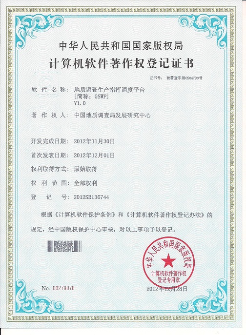 为充分展示大调查以来成果,扩大中央公益性地质调查工作影响,为找矿战略行动提供数据支持,及提升地质调查工作科学化管理、精细化管理和现代化管理的水平,在中国地质调查局主管部门的组织下,发展研究中心地质调查主流程信息化团队经过一年的努力,在前期数十年研究和技术积累的基础上,以基于跨平台中国地质调查信息网格GIS服务平台为依托,综合运用网格GIS、三维可视化、北斗卫星等技术,成功搭建了“中国地质调查数据网平台”和“地质调查生产指挥调度平台”。2012年12月,两个系统平台已分别获得计算机软件著作权。著作权人为中国地质调查局发展研究中心,授权单位为中华人民共和国国家版权局,证书号分别为:软著登字第0504710号、软著登字第0504780号。