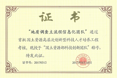 地质调查主流程信息化团队和个人顺利通过了国土资源部组织的考核,于2017年分别被授予“国土资源部科技创新团队”、“国土资源部科技领军人才”、“国土资源部杰出青年科技人才”称号。