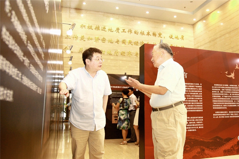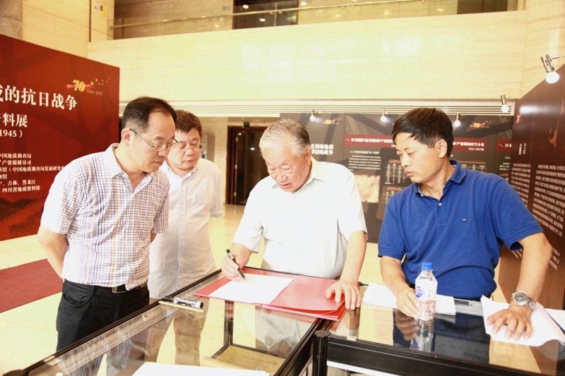 7月29日,原地质矿产部部长宋瑞祥参观地质调查领域抗日战争历史资料展,听取关于展览的详细介绍,与有关同志就展览内容进行深入探讨,并签名留念。
