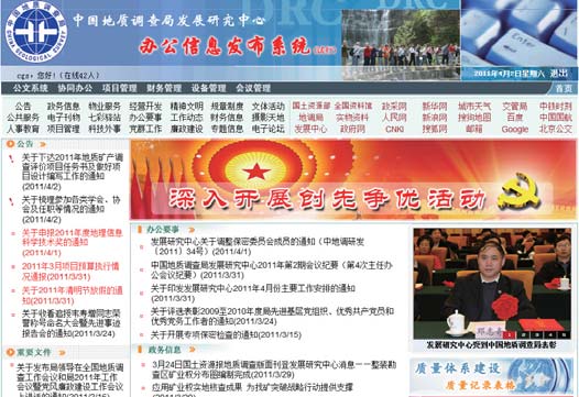 (1)局内网“中国地质调查局办公自动化系统”部署与应用。部署在中国地质调查局机关的地质调查办公自动化系统平台,实现一次认证,全网通行。可无缝接入办公信息发布、公文运转、会议管理、问卷调查、在线点播等办公应用子系统,设立了“民主信箱”、“局长信箱”等专用信箱。该系统是中国地质调查局机关人员重要的办公平台。公文系统实现了局机关“收文”、“发文”、“签报”等各类局机关33个工作流程的网上运转,系统提供了多种形式的文件监控、来文提醒、任务催办、任务跟踪、批示查询、短信提醒等功能。信息发布系统建立了“办公要事”、“廉政建设”、