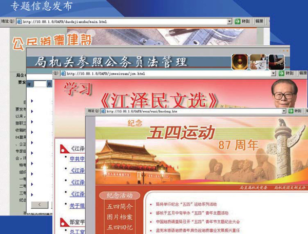 结构相结合的用户单点认证功能。办公信息发布具有灵活的用户权限分配、简便的栏目设置、信息发布、专题发布、消息提醒等功能。公文系统设计了局属单位通用的工作流和公文批单模板,实现了急件标识、超时标识、来件提醒、文件抄送、电子印章等功能。档案系统的开发与部署实现了文档一体化应用。