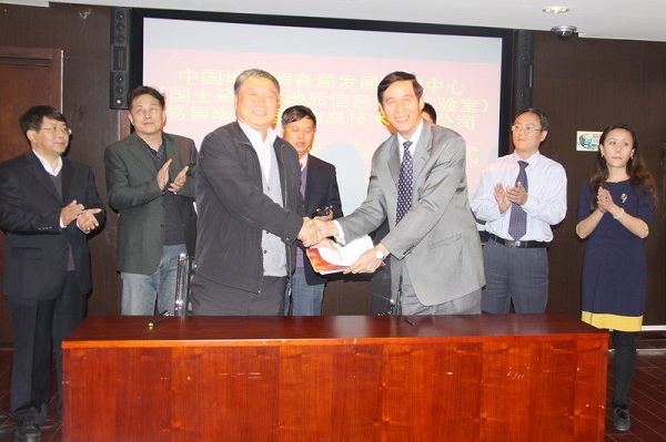 2014年11月26日上午,易智瑞(中国)公司总裁何宁一行到访中国地质调查调查局发展研究中心,发展研究中心主任严光生和易智瑞(中国)公司总裁何宁分别代表双方签订了战略合作框架协议。发展研究中心总工程师(实验室主任)谭永杰、副总工程师(实验室常务副主任)李超岭、副总工程师胡小平和易智瑞(中国)公司总裁何宁、技术总监沙志友、华北分公司总经理康铭、副总工程师陈非等出席了签字仪式。会议由总工程师谭永杰主持。