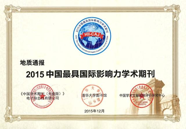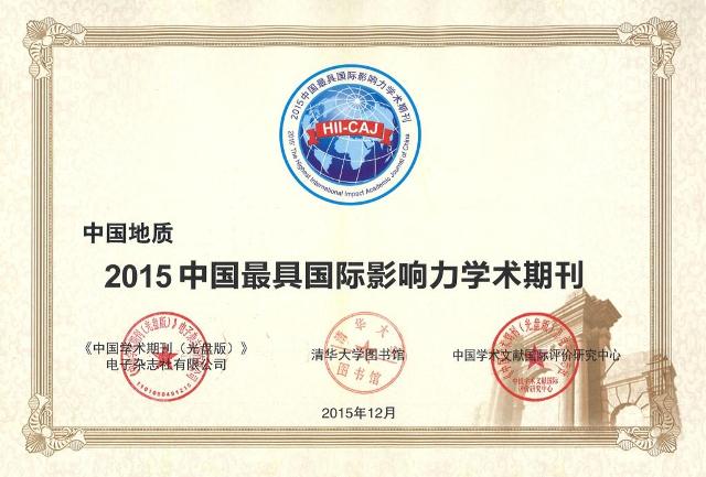 2015年12月18-19日在北京隆重召开的“2015年中国学术期刊未来论坛”上,中国学术期刊(光盘版)电子杂志社有限公司、清华大学图书馆和中国学术文献国际评价研究中心发布了“2015中国最具国际影响力学术期刊”和“2015中国国际影响力优秀学术期刊”。由中国地质调查局主办的《中国地质》和《地质通报》双双被评为“2015中国最具国际影响力学术期刊”,进入自然科学与工程技术类期刊TOP5%(175种)行列。 “中国最具国际影响力学术期刊”是由《中国学术期刊(光盘版)》电子杂志社有限公司、清华大学图书馆和中国学术文献国际评价研究中心对我国6306种中外文学术期刊进行评价、统计得出的。根据“期刊国际影响力指数CI”的高低,遴选出“中国最具国际影响力学术期刊(自然科学与工程技术)”175种(TOP5%),“中国国际影响力优秀学术期刊(自然科学与工程技术)”175种(TOP5%~TOP10%)。 研究结果表明,“中国最具国际影响力学术期刊”(TOP5%)和“中国国际影响力优秀学术期刊”(TOP5%-TOP10%)入选期刊的综合评价指标、影响力已经可与SCI、SSCI国际期刊相比肩,是国内名副其实的顶级学术期刊。该奖项的获得是对《中国地质》、《地质通报》两刊内容质量和影响力的进一步肯定,我们将再接再厉,更上一层楼!